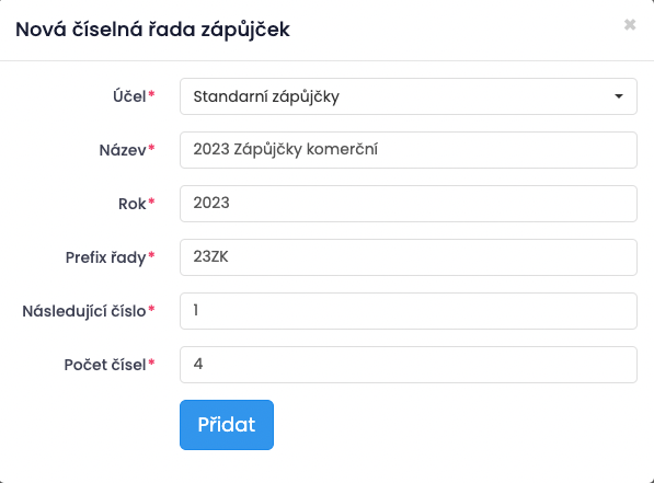 Novou číselnou řadu přidáte přes tlačítko +Přidat vpravo nahoře.