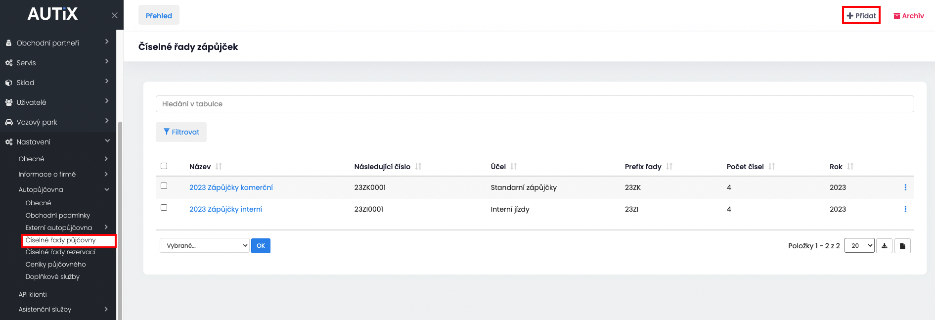 Nastavení - Autopůjčovna - Číselné řady půjčovny