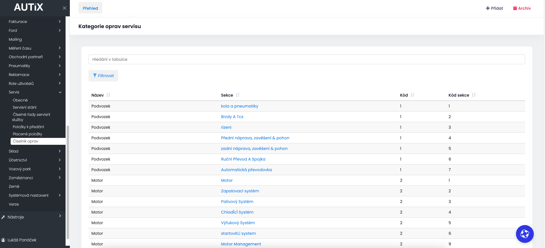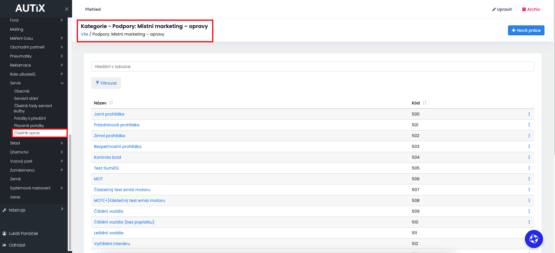 Nastavení - Servis - Číselník oprav