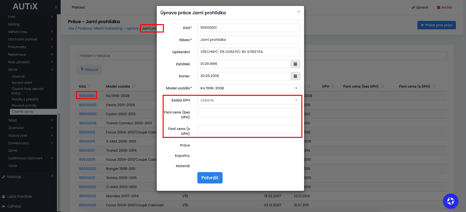 Po kliknutí na Jarní prohlídka -> kliknutí na první kód, lze upravit cenu pro Ford Ka 1996-2008.