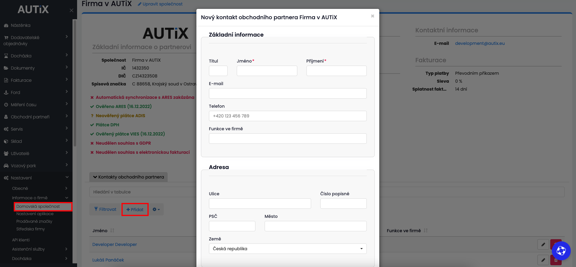 Můžete také přidat další kontakty Vaší společnosti, přes znázorněné tlačítko +Přidat.