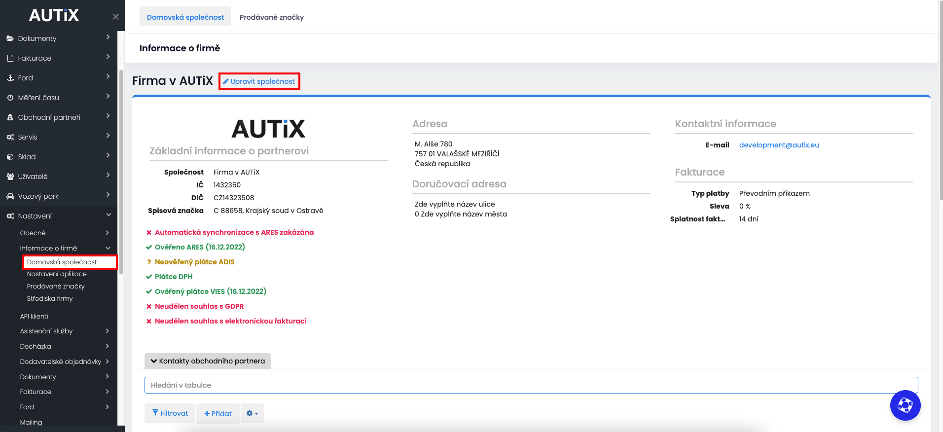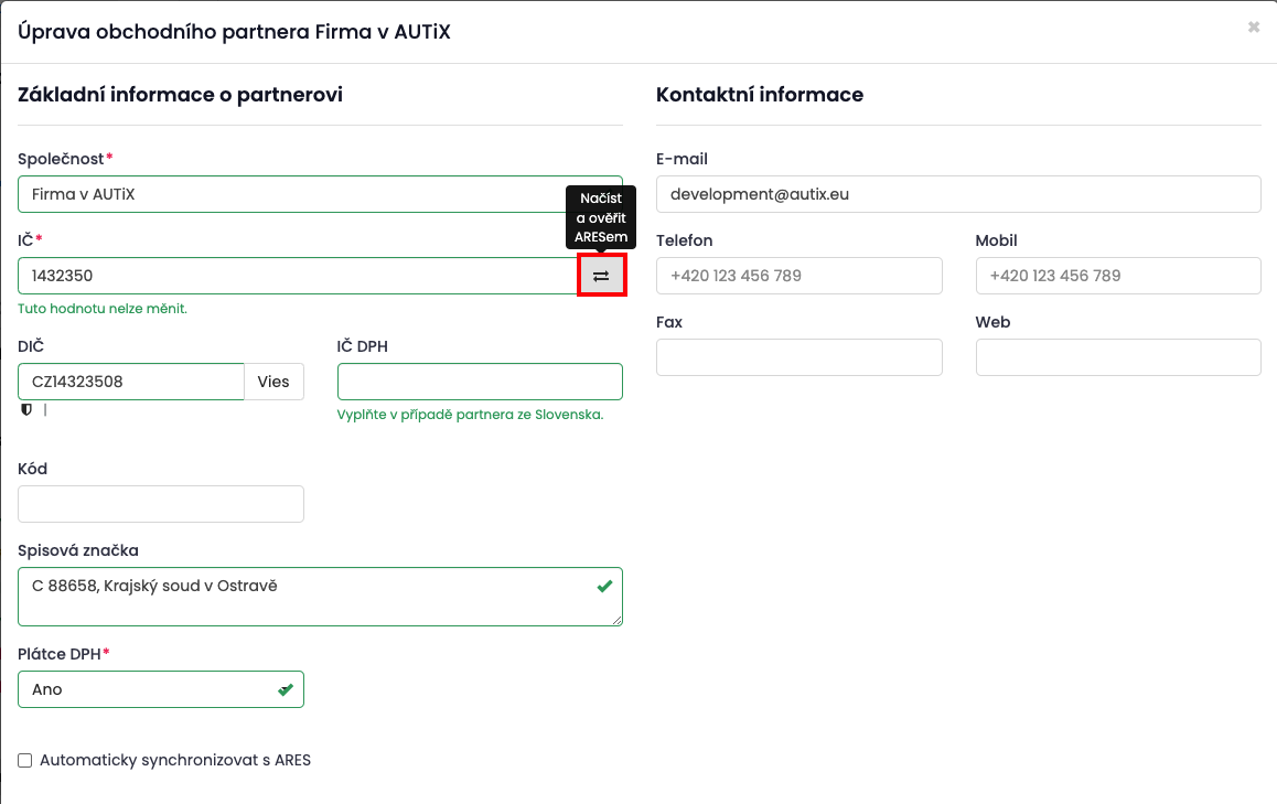 Automatická synchronizace s ARES je pro Vaší společnost defaultně vypnutá (v případě obchodních partnerů je naopak zapnutá).