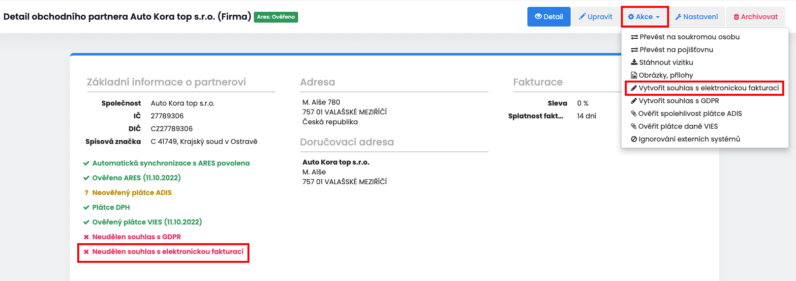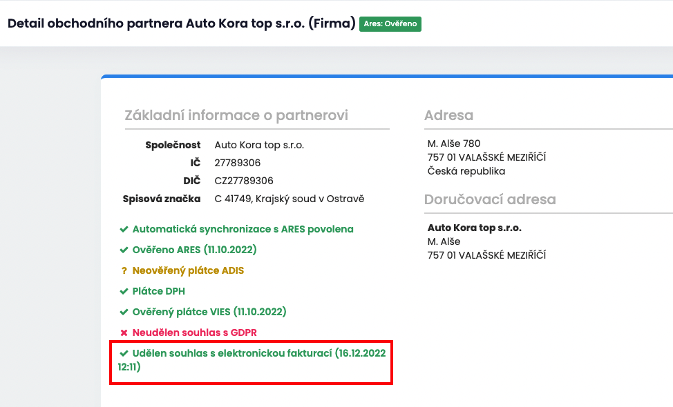 V detailu obchodní partnera vidíte, jestli má udělen souhlas s elektronickou fakturací a nebo tento souhlas můžete vytvořit.