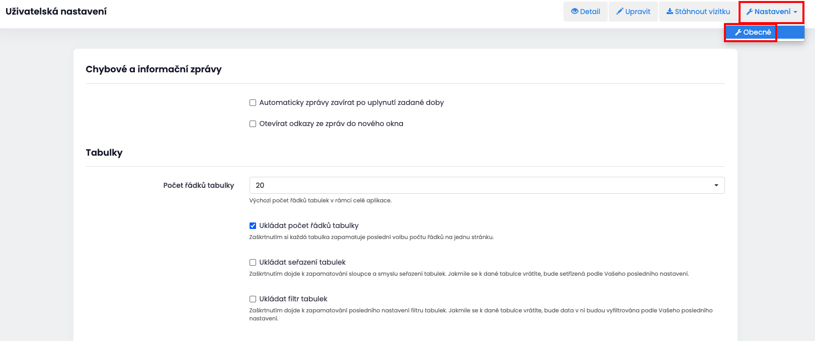 Dále si můžete zvolit nastavení tabulek, např. kolik řádku (záznamů) se Vám bude ukazovat v tabulce. Jde o tabulku (grid) ve skladu, objednávkách, servise, atd.