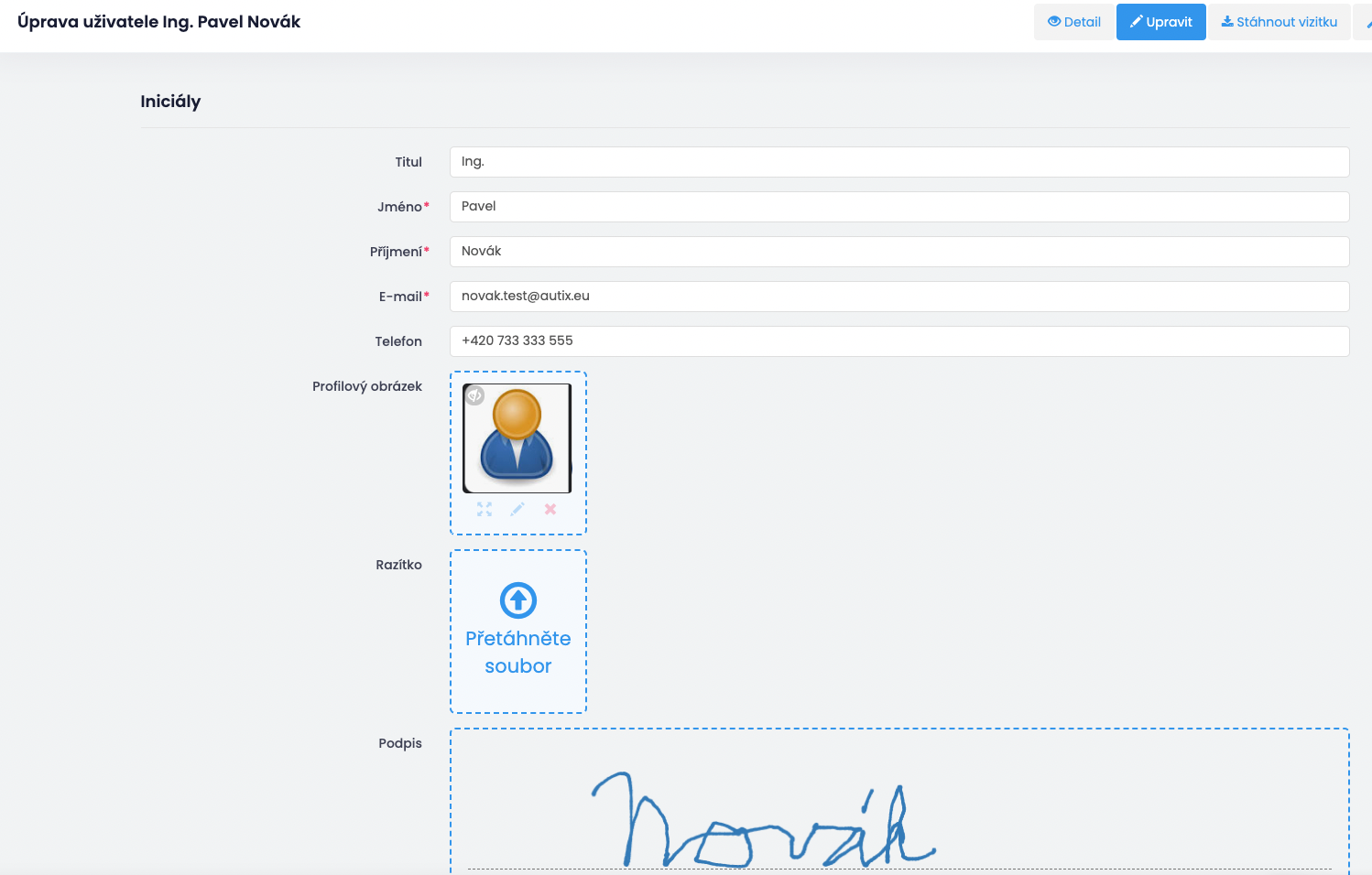 Můžete si upravit např. telefon, nahrát profilový obrázek, razítko, podpis, nebo si změnit heslo.